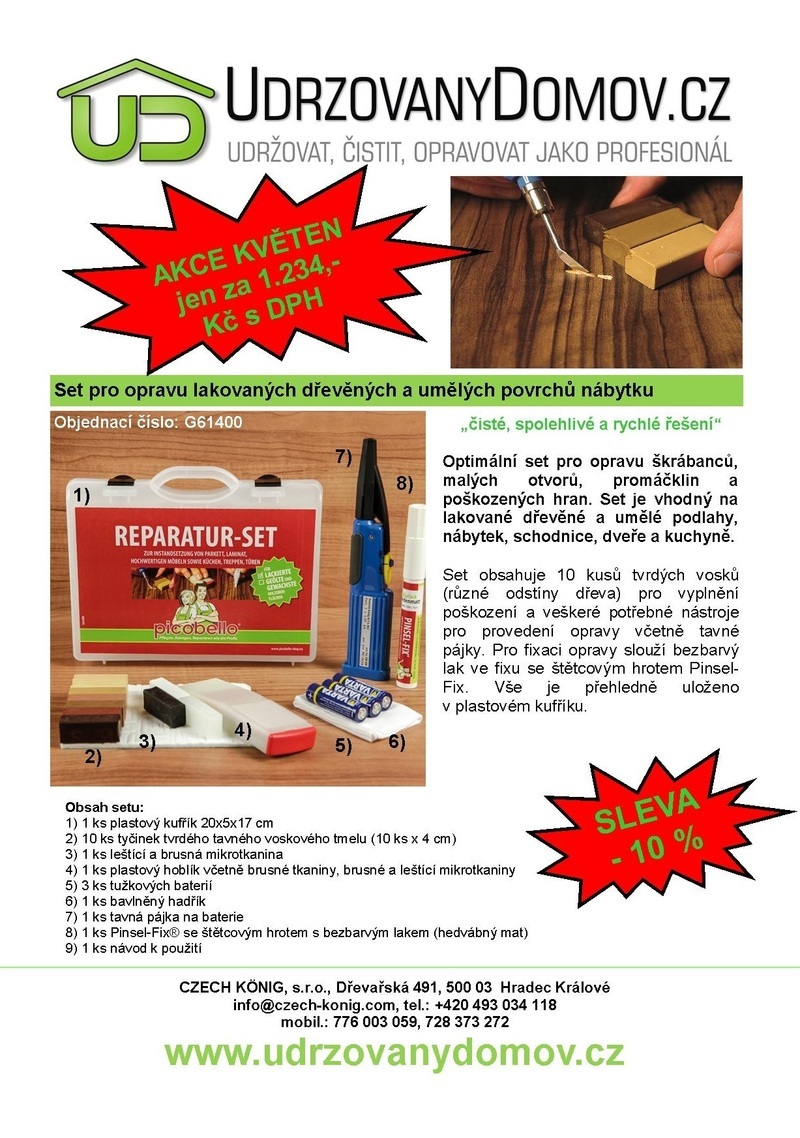 Servisní set pro opravu malých vrypů, promáčklin a poškozených hran na povrchu dřevěného a umělého nábytku od německého výrobce KÖNIG. Opravný set obsahuje 10 kusů různých odstínů tvrdých tavných voskových tmelů pro vyplnění poškození a veškeré potřebné nástroje pro provedení opravy a to včetně tavné pájky na tužkové baterie. Pro opracování tmelů je přiložena patentovaná hoblovací špachtle. Pro fixaci opravy je k dispozici bezbarvý lak ve fixu se štětcovým hrotem. Vše je přehledně uloženo v plastovém kufříku.
