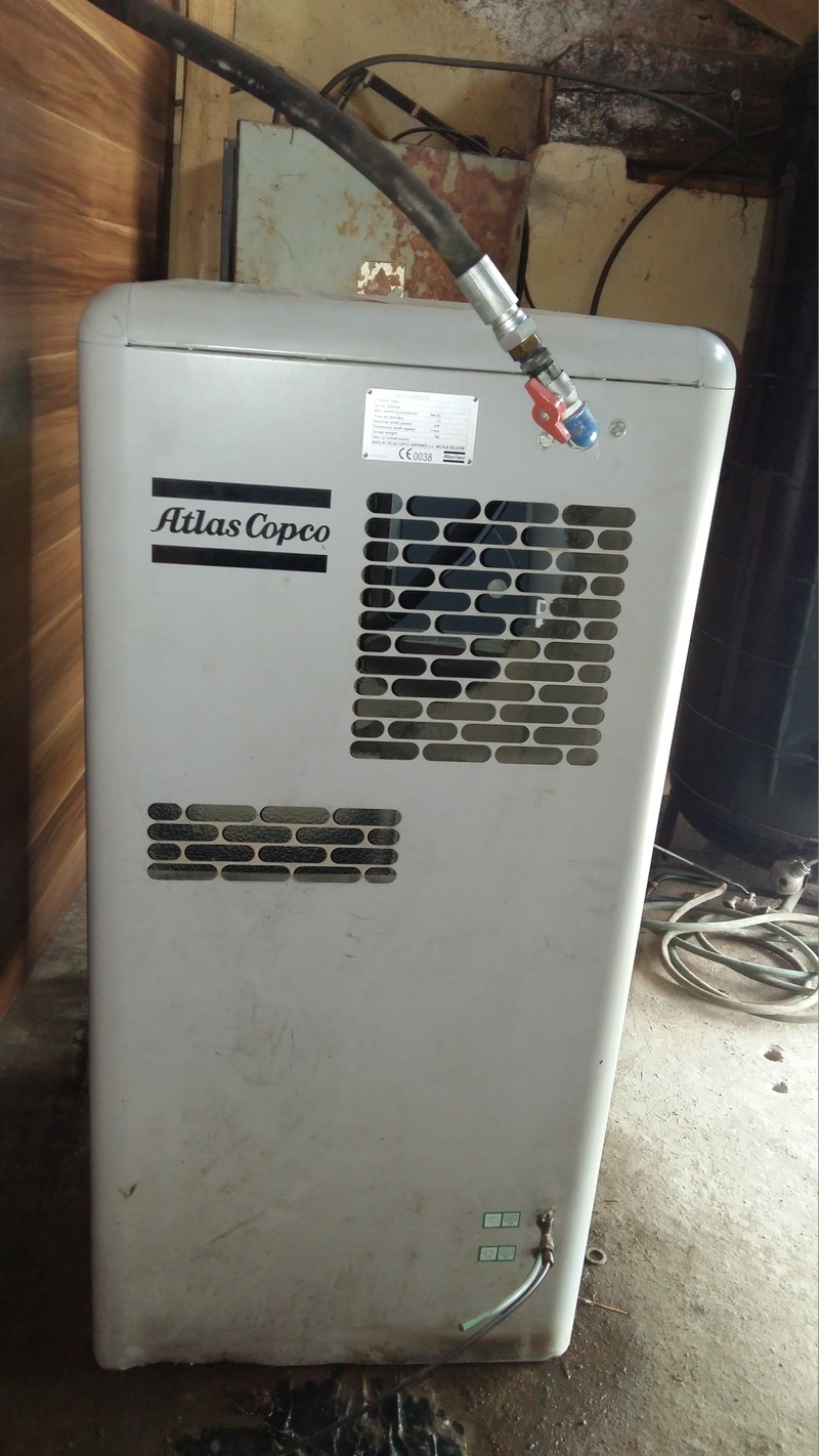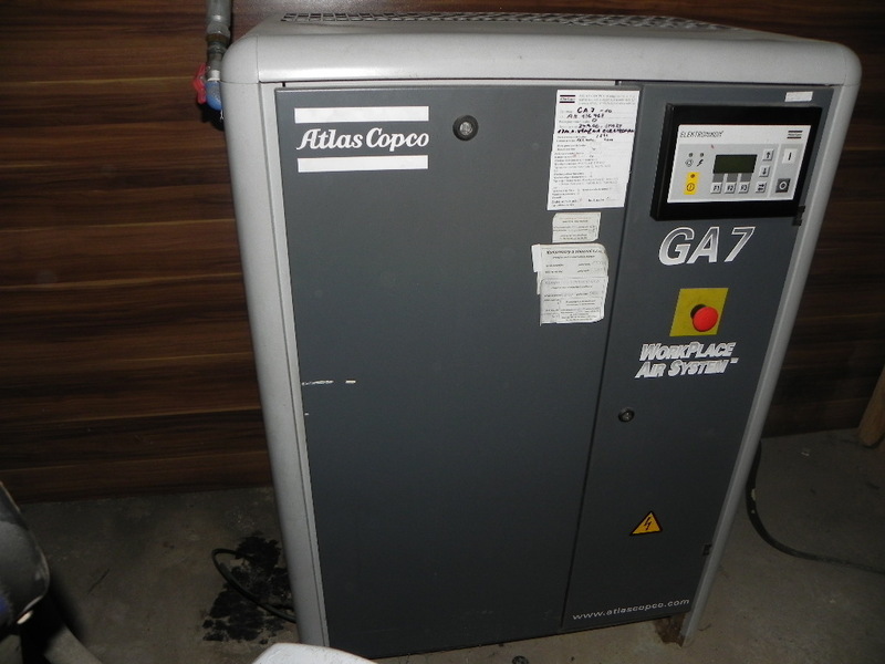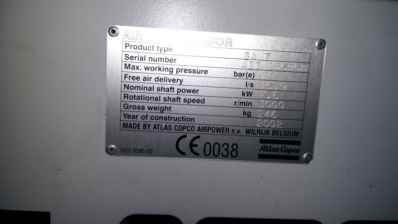 Kompresor ATLAS Copko GA7-10, r.v. 2002, celková hmotnost 246 kg, motor 705 kW, Tlak 10 barů. Výkon stlačeného vzduchu 15,9 litrů za sekundu 954 litrů za minutu 57 240 litrů za hodinu