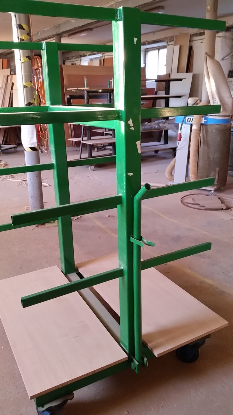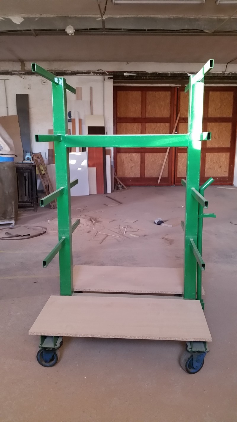 Stojany pojízdné s otočnými koly a rukojetí – vojí. Každé kolo nosnost 70 kg. Spodní police od země 29 cm, mezi policemi 45cm. Velká nosnost, vyrobeno na zakázku, možnost použit do truhlářských, kovo dílen atd. Více kusů. Cena za kus 1.990,-