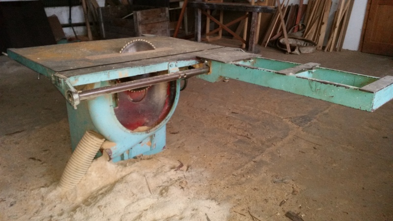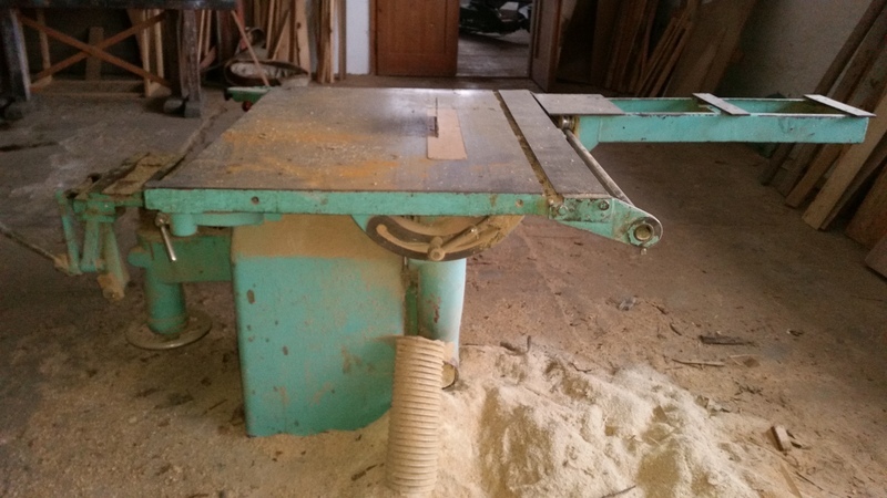 Kotoučová pila s pojezdovým vozíkem a dlabačkou REMO, rok výroby 1972.
