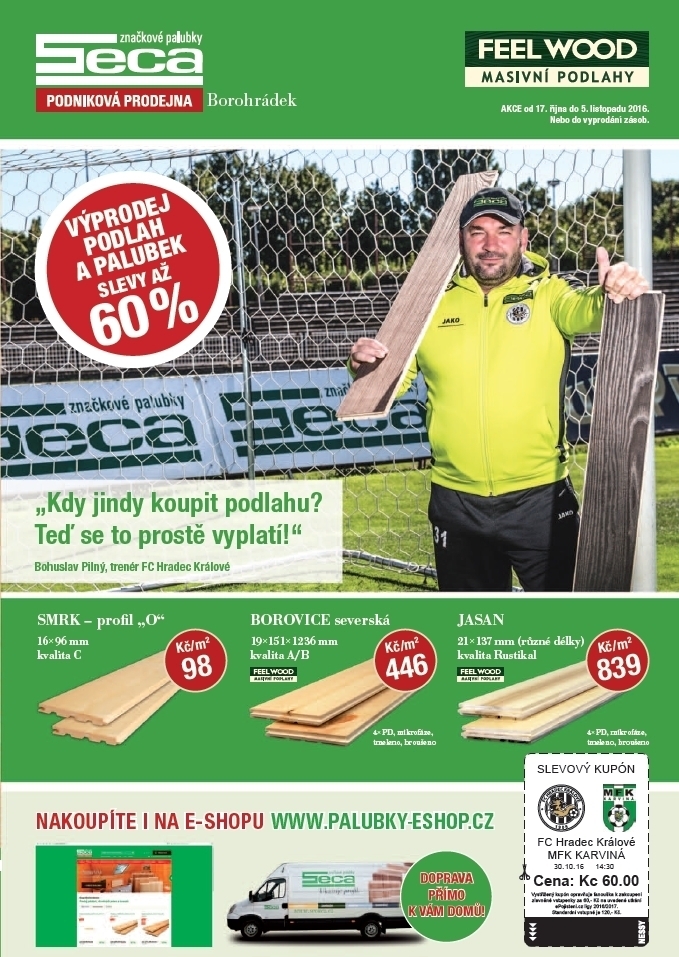 „Kdy jindy koupit podlahu? Teď se to prostě vyplatí!“ ... Slevy až 60 % na palubky a podlahy v podnikové prodejně v Borohrádku. Zboží z letáku lze koupit také na eshopu SECA. Podrobnosti najdete v akčním letáku.