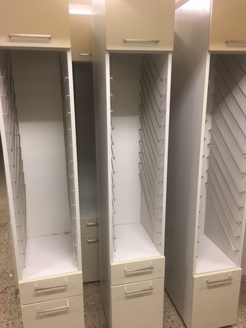 Regál na vzorky dvířek a desek od 6mm do 38mm vyrobeno z LTD 18mm vnější rozměry šířka 335mm, výška 2020mm, hloubka 460mm.