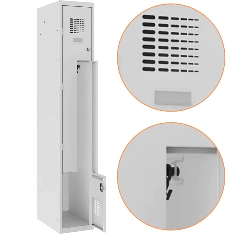Tento typ kovové oděvní skříně je ideálním řešením jak pro pracoviště, tak pro všechny druhy sportovních zařízení. Dveře kovové skříňky na oblečení byly vyrobeny z 0,6 milimetru tlustého plechu a zbývajících prvků z plechu, jehož tloušťka je 0,5 milimetru.