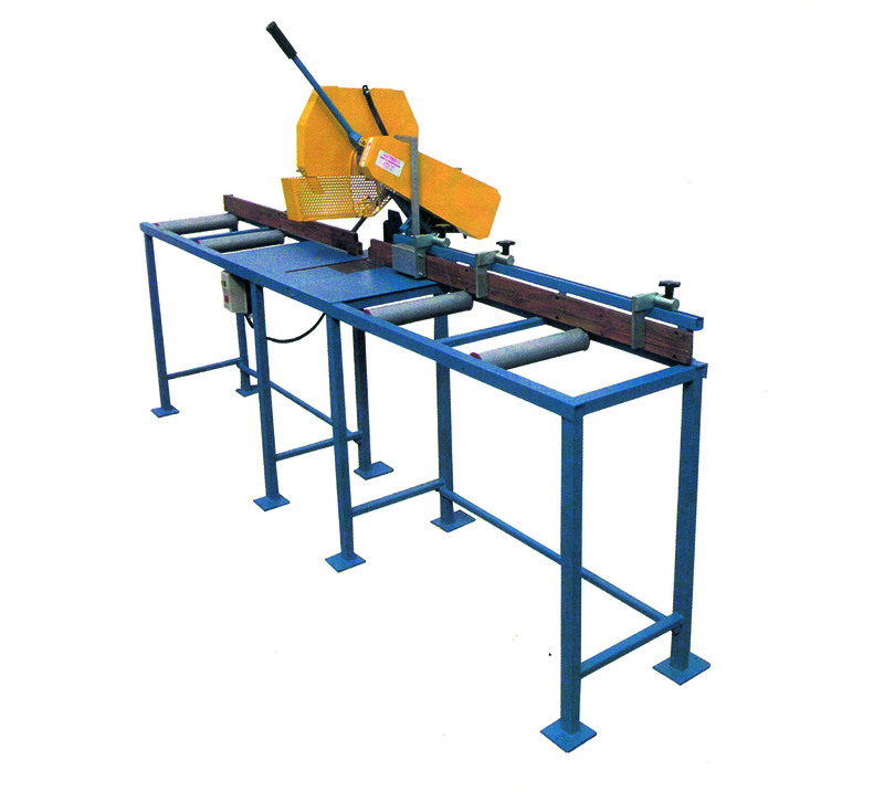 El. motor 2,2 nebo 3 kW. Max. průměr řezného nástroje 400 mm. Posuv řezaného materiálu zleva, zprava nebo z obou stran. Počet stavitelných sklopných dorazů a délka přísuvného a odběrného dopravníku dle dohody. Otvor pro odpad krátkého řeziva.