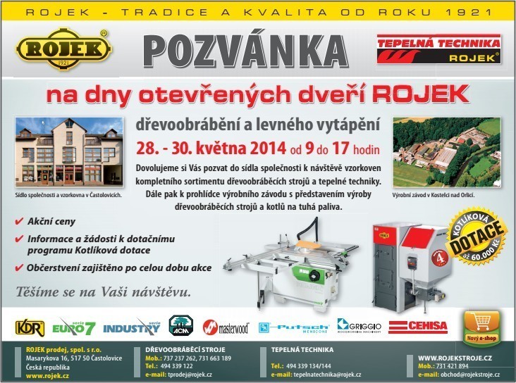 Dovolujeme si Vás pozvat do sídla společnosti ROJEK k návštěvě vzorkoven kompletního sortimentu dřevoobráběcích strojů a tepelné techniky. Dále pak k prohlídce výrobního závodu s představením výroby dřevoobráběcích strojů a kotlů na tuhá paliva. Dny otevřených dveří ROJEK se konají ve dnech 28. - 30. května v Častolovicích.