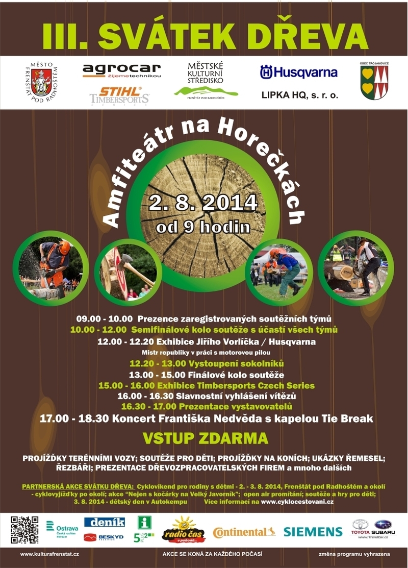 Začátek 02.08.2014 00:00 konec 02.08.2014 00:003. ročník Svátku dřeva ve Frenštátu pod Radhoštěm Na tuto jedinečnou akci je vstup zdarma a uskuteční se za každého počasí. Pro účely festivalu bude k dispozici louka u lanovky (bývalý areál zdraví), amfiteátr na Horečkách, velká louka naproti restaurace Rekovice a louka nad Pantátou u zvoničky Strážkyně Beskyd. Celkově se tak bude Svátek dřeva konat na ploše cca 20 000 m2.